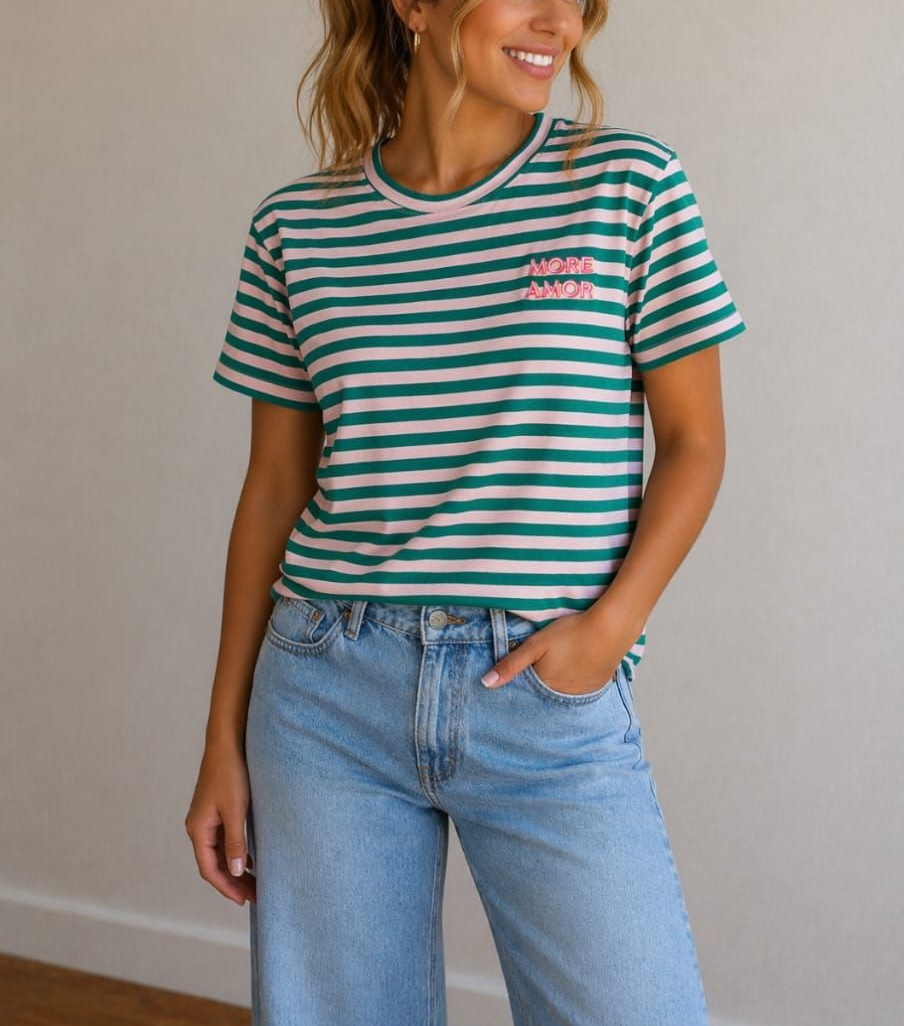 Dit gestreepte T-shirt is een fris en comfortabel item met een rustige en moderne uitstraling. De combinatie van groen en roze strepen geeft het shirt een zachte, zomerse look, terwijl de soepele stof zorgt voor een prettig draaggevoel. De wijde mouwen en relaxte fit geven het geheel een nonchalante en eigentijdse uitstraling.